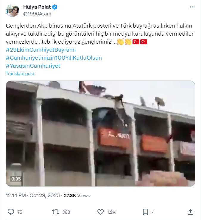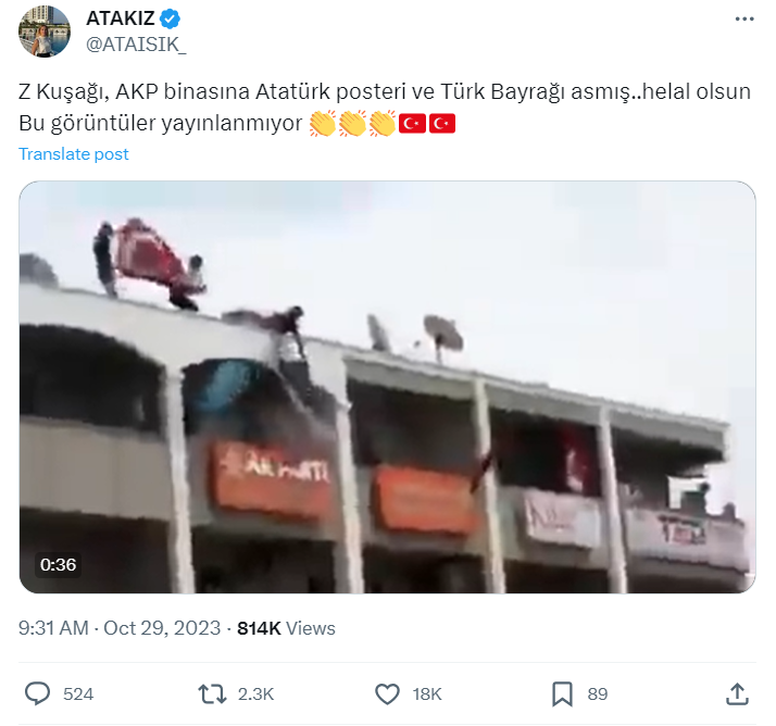 29 Ekim 2023’te Türkiye Cumhuriyeti’nin 100.yılı vesilesiyle ülkenin her yerinde törenler ve kutlamalar gerçekleştirildi. Sosyal medyada da en çok konuşulan konu Cumhuriyetin 100.yılı oldu. Neredeyse her binaya Türk bayrağı veya Atatürk posteri asılan bu dönemde sosyal medyada paylaşılan video ise kafa karışıklığına yol açtı. Videoda AK Parti tabelası görünen bir binaya Türk bayrağı ve Atatürk posterinin asılma anı kaydedilmişti. İddia sahibi, bayrak ve posteri asanların Z kuşağı olduğunu; ancak bu görüntülerin hiçbir medya kuruluşunda yayınlanmadığını belirtti.
