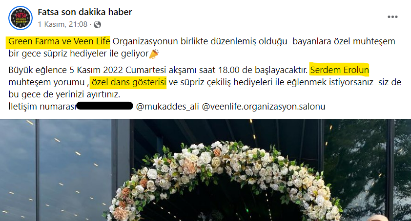 Doğrula, duyurulardaki etkinlik organizasyon firması Veen Life Organizasyon Salonu’na ulaştı. Organizasyon firmasına söz konusu etkinliği AK Parti Ordu Kadın Kadın Kolları tarafından düzenlenip düzenlenmediğini sorduğumuzda ise, “5 kasımda mekanımızı bir kozmetik firmasına kiraya verdik bu firmanın hiç bir siyasi parti ile alakası yoktur.“ yanıtını aldık. Daha öncesinde de benzer etkinlikler düzenlendiğini ve kadınlara özel bir eğlence programı gerçekleştirdiklerini dile getirdiler. Organizasyon firması, Merve Acerbaş’ın etkinlikte bulunduğunu ancak siyasi kimliğinden bağımsız eğlence amaçlı etkinliğe katıldığını belirtti.