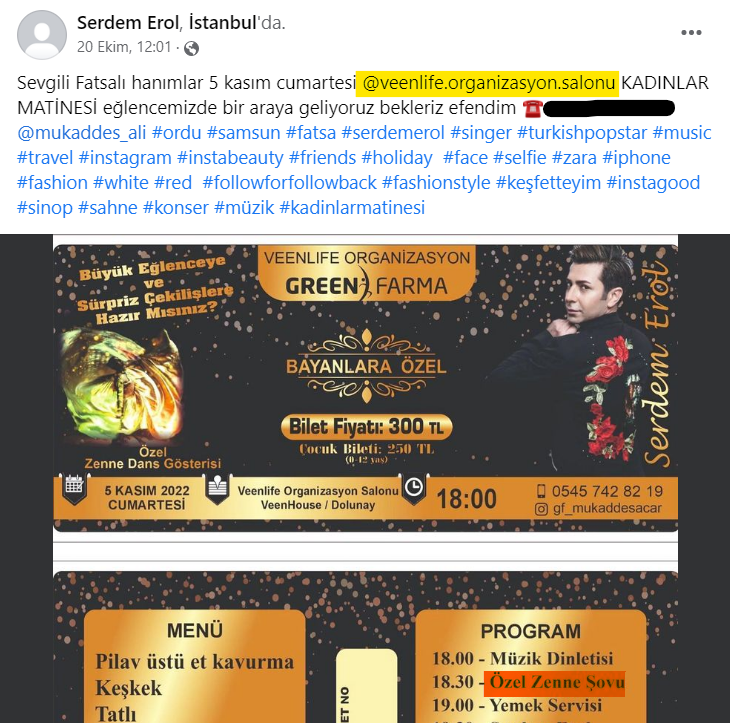 Duyurudaki bilgilerden yola çıkarak Serdem Erol ismini araştırdık. Serdem Erol aynı etkinliği kendi facebook hesabından da paylaşmış. Duyurusu yapılan etkinliğe bakıldığında 18.30’da zenne gösterisi olacağı belirtilmiş. Serdem Erol’un hesabını incelediğimizde ise, etkinlikte Prens Aytaç isimli kişinin de özel dans gösterisine dansçı olarak katıldığı bilgisine ulaşıyoruz.
