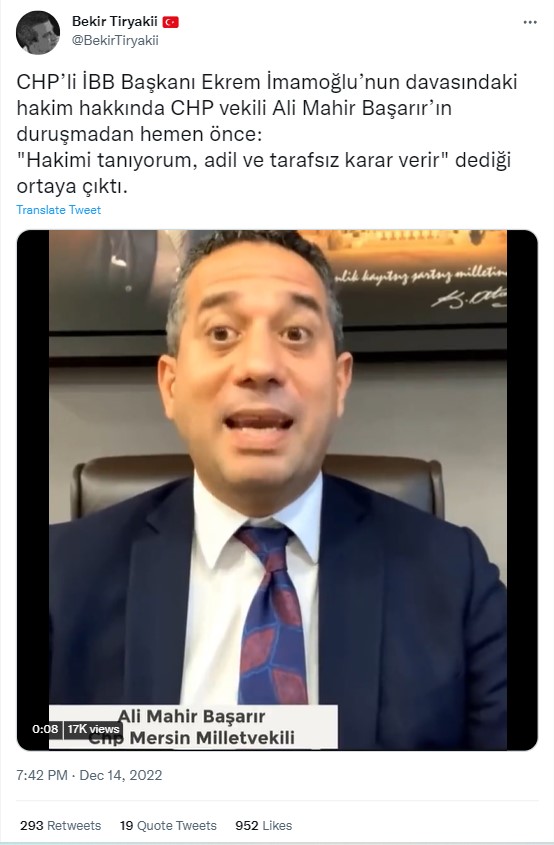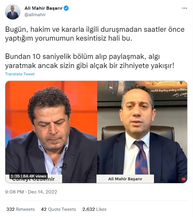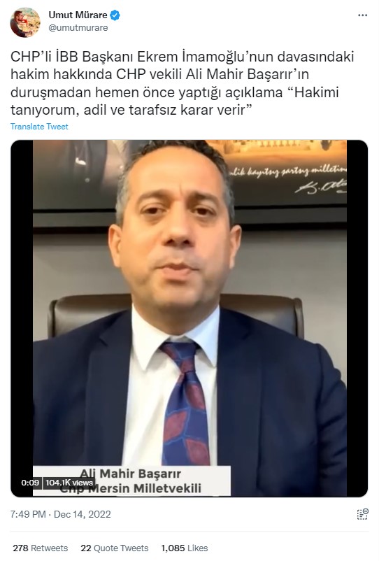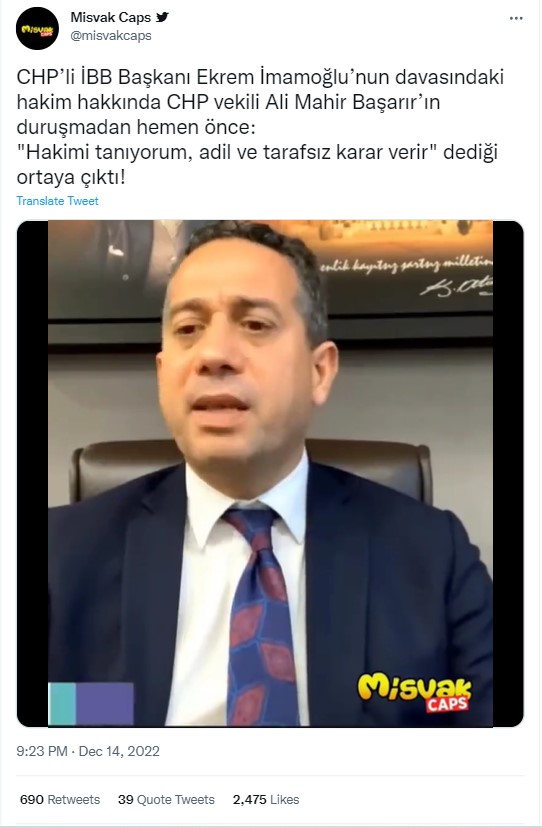 - CHP Mersin Milletvekili Ali Mahir Başarır’ın Cüneyt Özdemir’in YouTube canlı yayınında Ekrem İmamoğlu davasının hakimi ile ilgili söyledikleri bağlamından koparılarak çarpıtılmış.