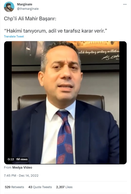 İddialar üzerine CHP Mersin Milletvekili Ali Mahir Başarır, Twitter hesabından videonun 1 dakika 40 saniyelik versiyonuyla birlikte mevzubahis söyleminin tamamını paylaşmış; ‘Bugün, hakim ve kararla ilgili duruşmadan saatler önce yaptığım yorumumun kesintisiz hali bu.’ şeklinde not düşmüş.