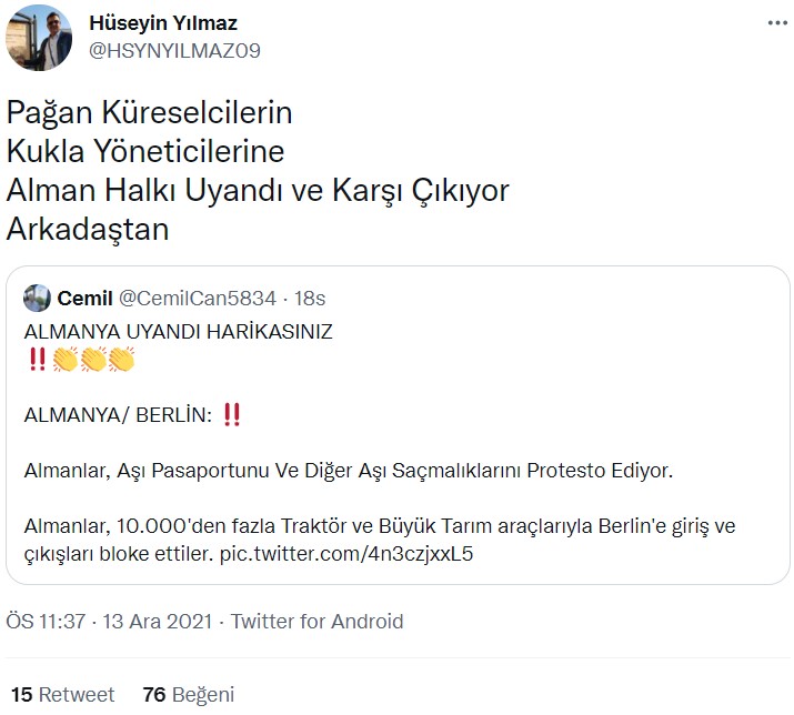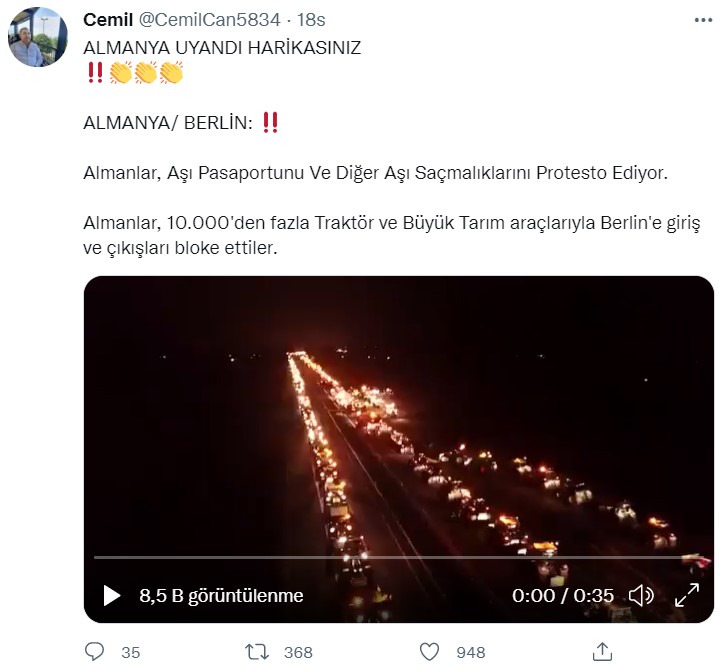 Sosyal medyada ‘aşı karşıtlığıyla’ bilinen manipülasyon hesaplarının, dünyanın farklı yerlerinde, geçmiş tarihlerde yaşanmış protestoları ‘pandemi protestosu’ymuş gibi göstermesine sıklıkla rastlıyoruz. Buna örnek olarak Twitter’da paylaşılan ve binden fazla etkileşim alan bir Tweet gösterilebilir.