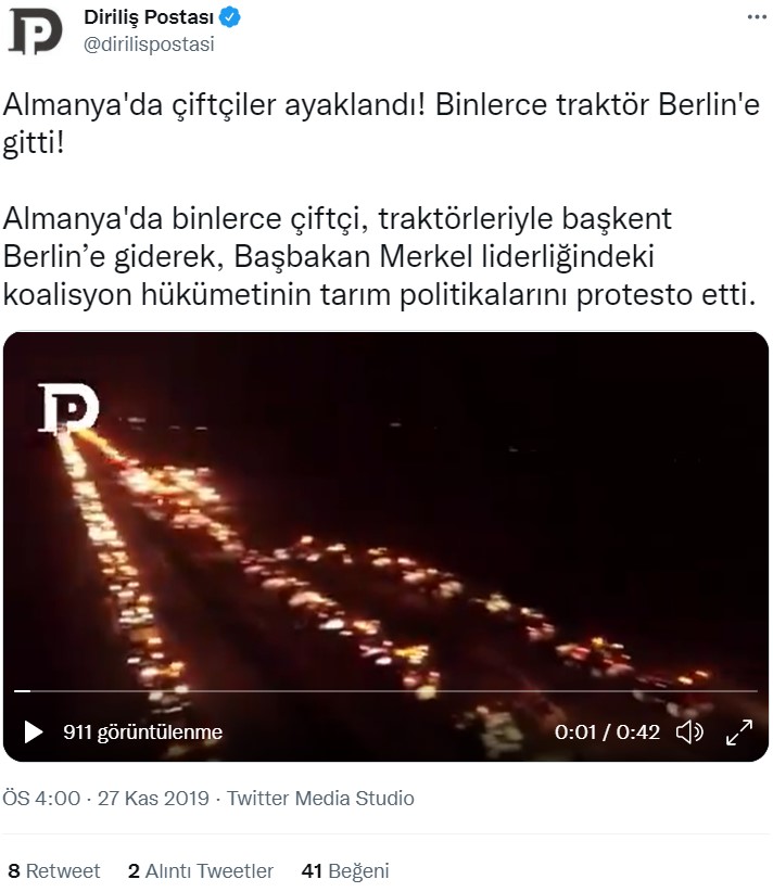 Videonun ilk karesini ekran görüntüsü alıp, arama motorlarının görsel arama özelliğini kullanarak taradığımızda ilgili habere ulaştık. 2019 kasım’da paylaşılan TRT World’ün haberine göre, Alman çiftçiler, hükümetin tarım politikalarına karşın Berlin otoyolunda traktörlerinin kontağını kapatmış. İddiaya konu olan fakat aslı bambaşka olan bu haber yalnızca dış basında değil, Türkiye basınında da yer bulmuştur.