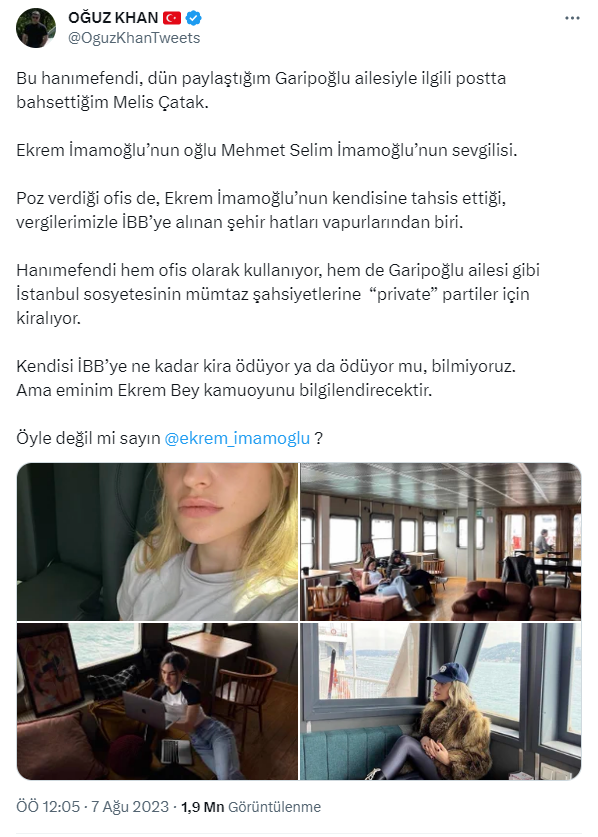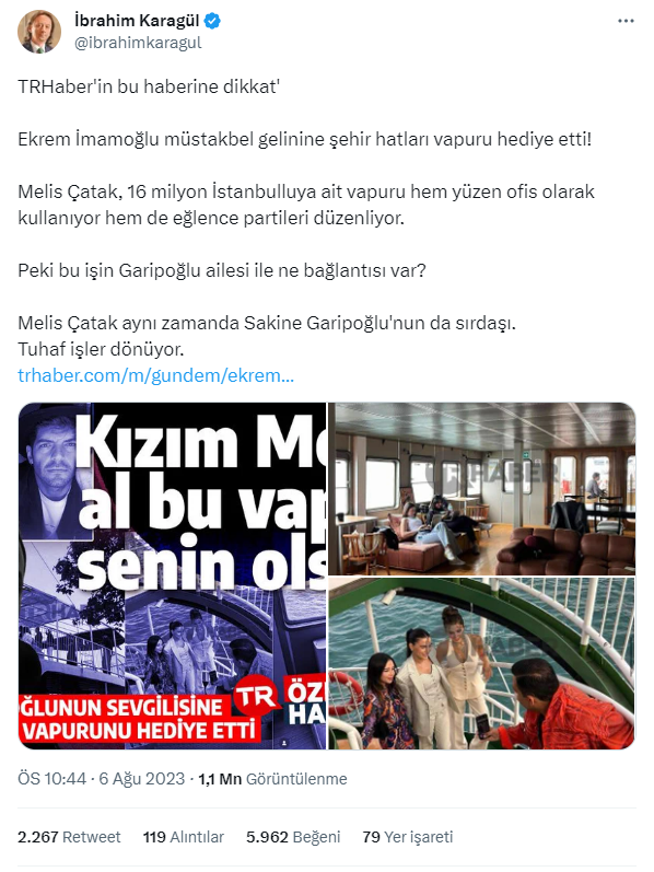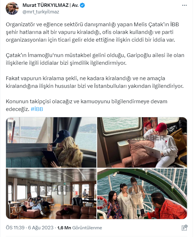 AK Parti İBB Meclis üyesi ve grup sözcüsü Sn. Murat Türkyılmaz’ın 06.08.2023 tarihinde, saat 23.39’da sosyal medya üzerinden yaptığı paylaşımda yer alan, organizatör Melis Çatak’a Şehir Hatları’na ait bir geminin + pic.twitter.com/enJ9lQVjh6