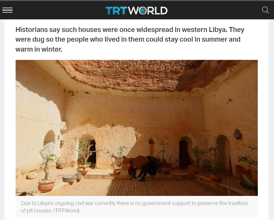 YouTube platformunda çukur evlere dair belgesel ve haberlere ulaşmak mümkün. TRT World’ün Libya’daki çukur evlerin hala kullanımda olduğuna dair videosunda benzer yapıların bulunduğunu görüyoruz. Başka kaynaklarda da, bu yapıların Libya’nın Trablusgarp bölgesinde yer alan Geryan kasabasına özgü olduğu belirtiliyor.