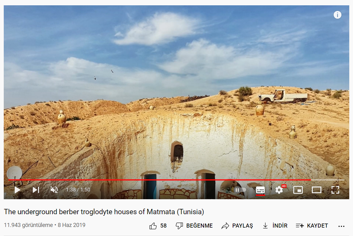 Yine YouTube platformunda Tunus’un Matmata kasabasına dair paylaşılan bir videoda da bu yapıların örneklerini görüyoruz. Farklı kaynaklarda da Tunus’un Matmata kasabasında bu çukur evlerde hala yaşayan sakinlerin olduğuna dair haber ve görsellere erişilebiliyor.
