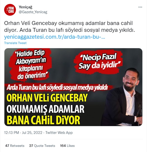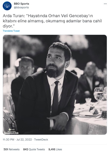 22 Temmuz 2022 tarihinde @bbosports tarafından yapılan paylaşımda Arda Turan’ın ‘Hayatında Orhan Veli Gencebay’ın kitabını eline almamış, okumamış adamlar bana cahil diyor.’ dediği iddia edildi.