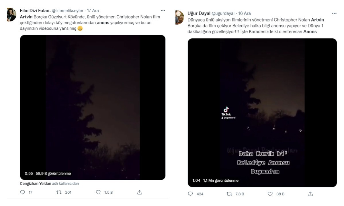 Aslında iddia kaynağı videoya dair söz konusu söylemlerin gündeme gelmesinin sebebi, Uğur Dayal adlı sosyal medya kullanıcısının Tiktok ve Twitter gibi sosyal medya platformlarında yaptığı paylaşımlar. Dayal, “Dünyaca ünlü aksiyon filmlerinin yönetmeni Christopher Nolan Artvin Borçka da film çekiyor Belediye halka bilgi anonsu yapıyor ve Dünya 1 dakikalığına güzelleşiyor!!! İşte Karadenizde ki o enteresan Anons” başlığı ile sosyal medya hesabından paylaştığı videonun “şaka” amaçlı olduğunu söyledi.