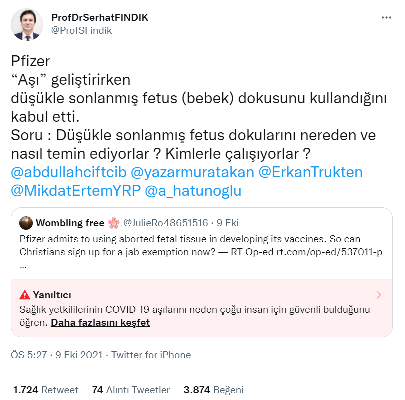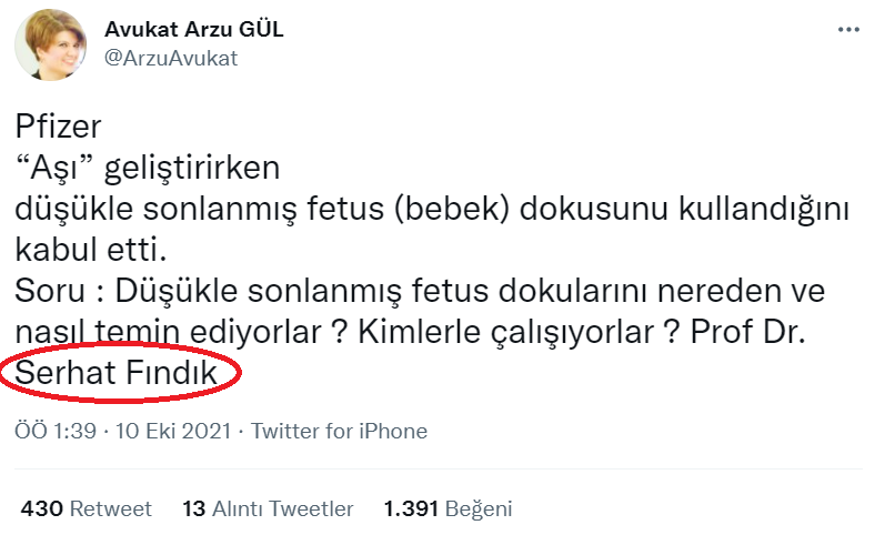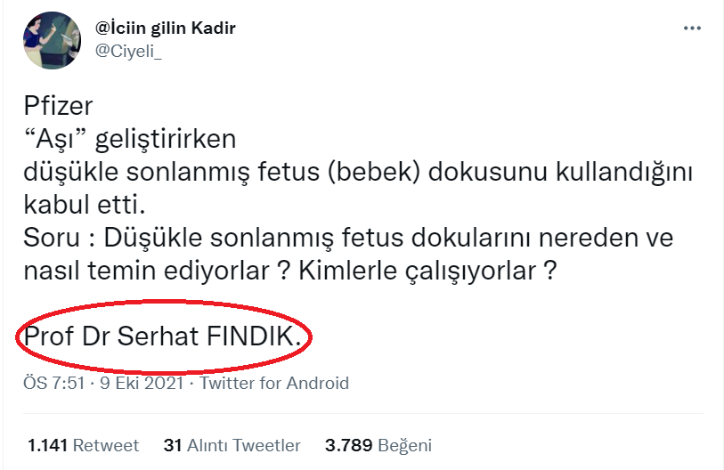 Uzun süredir sosyal medyanın gündeminde yer alan COVID-19 aşılarının fetus içerdiği iddiası dikkatleri üzerine çekiyor. Aşı karşıtlığı ile tanınan Prof. Serhat Fındık tarafından 09.10.2021’de Twitter’da paylaşılan bu iddia kısa sürede yayılım göstererek yüksek oranda etkileşim aldı. Birçok sosyal medya kullanıcın desteğini alan Fındık’ın iddiasına şüphe ile yaklaşan kullanıcılar da var. Peki Pfizer Covıd-19 aşısı futus (bebek) dokusu içeriyor olabilir mi? Tüm detaylarıyla araştırdık. Prof.Serhat Fındık’ın Pfizer COVID-19 aşısının hamilelik sürecindeki anne karnındaki bebek, bilimsel adıyla fetus içerdiği iddiası yoğun ilgi gördü. Fındık’ı referans göstererek iddia hakkında paylaşım yapan çok sayıda sosyal medya kullanıcısı var.