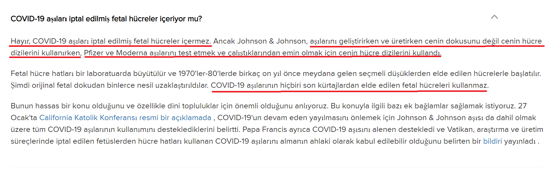 ABD’de kullanılan COVID-19 aşısı, Philadelphia Çocuk Hastanesi’ndeki Aşı Eğitim Merkezi’ne göre; aşılar 1985’te bir fetüse kadar uzanan retina hücreleri kullanılarak büyütülen bir adenovirüs kullanılarak üretiliyor. Suçiçeği ve diğer hastalıklar üretilen aşılarda da bu tür bir işlem uygulanıyor. Ancak bu aşıların hiçbiri cenin hücresi içermiyor.