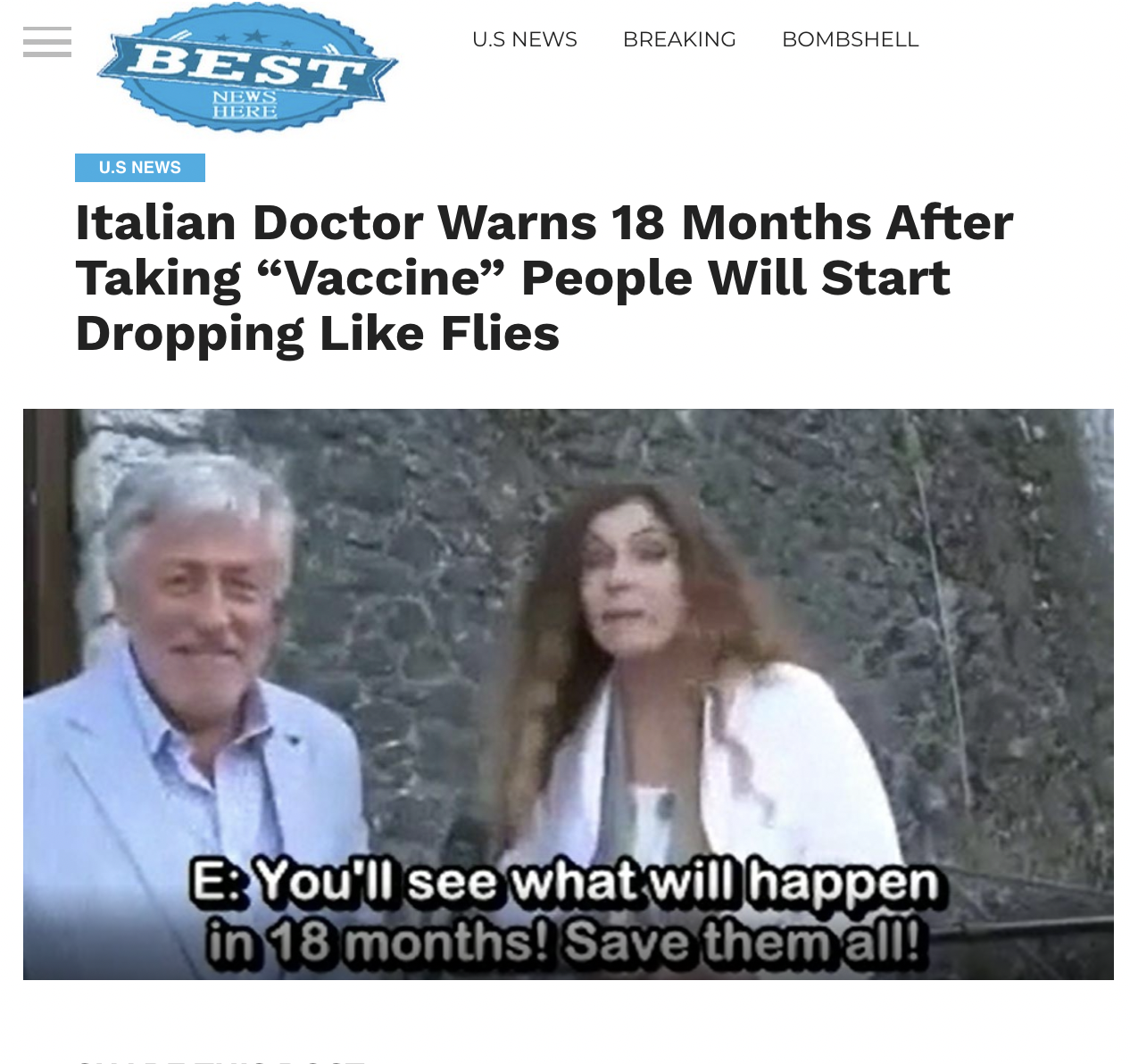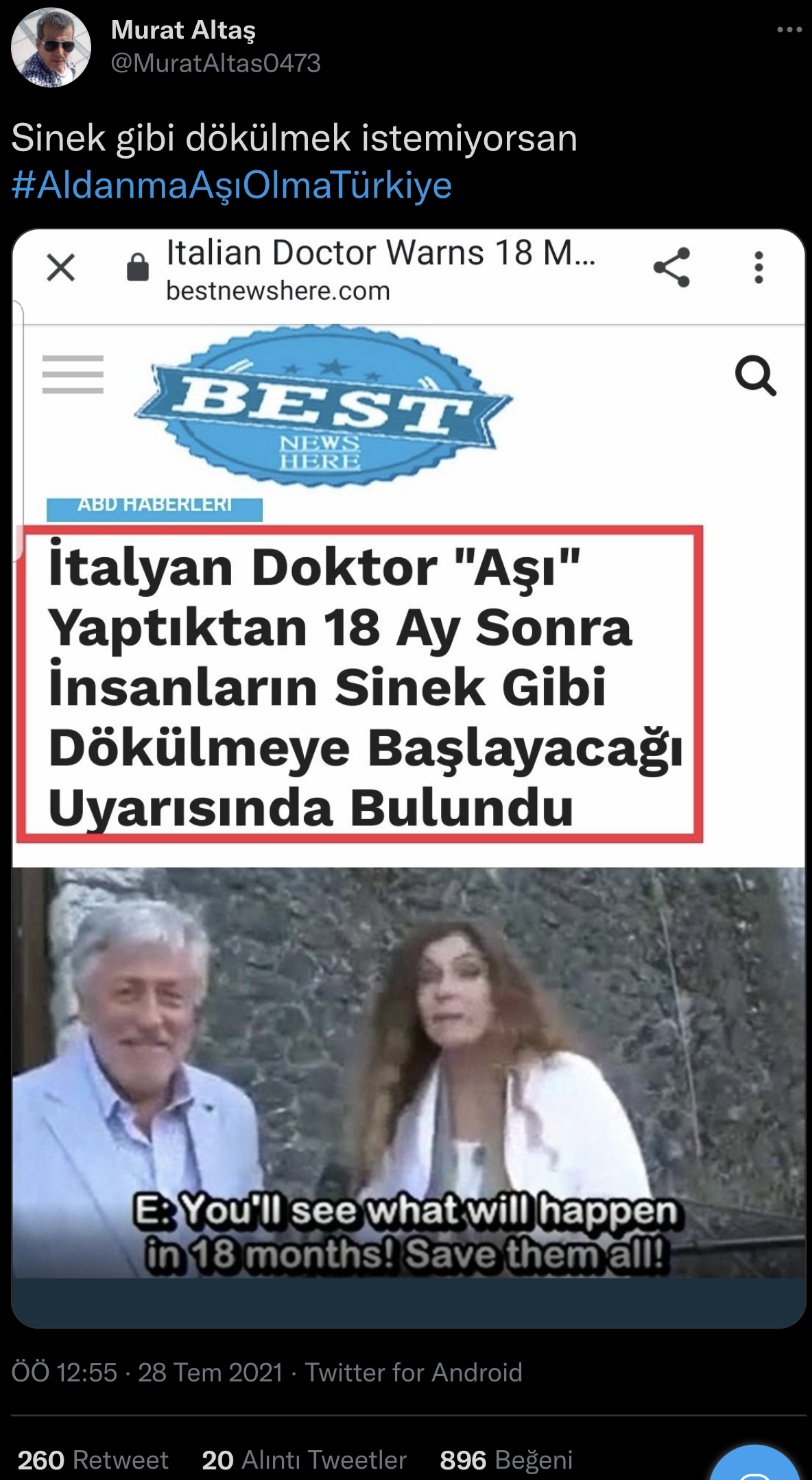 #AldanmaAşıOlmaTürkiye etiketi Twitter’da gündem başlıkları arasındaydı. Etiketteki paylaşımlarda bir video radarımıza girdi. Tweet’deki ekran görüntüsünde yer alan “İtalyan doktor aşı yaptıktan 18 ay sonra insanların sinek gibi dökülmeye başlayacağı uyarısında bulundu” başlığı dikkatimizi çekti. Doktorun adının kasten belirtilmemesi, görsel kalitesi, aşı karşıtı aykırı söylem gereği doktor olduğu iddia edilen kişiyi araştırma gereği duyduk.