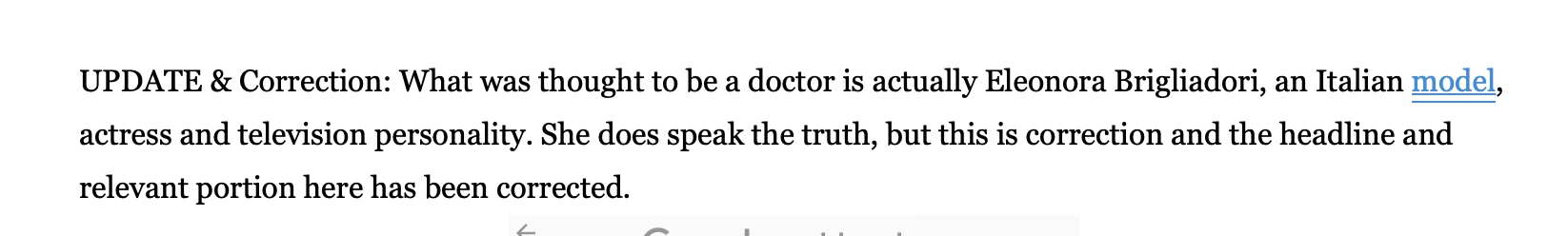 Ayrıca The Washington Standart adlı haber mecrasının iddia kaynağı video hakkında: ”Doktor olduğu düşünülen aslında bir İtalyan model, oyuncu ve televizyon kişiliği olan Eleonora Brigliadori’dir. Doğru söylüyor ama bu bir düzeltmedir ve buradaki başlık ve ilgili kısım düzeltilmiştir” diyerek video hakkında yayımladığı 24.07.2021 tarihli bir düzeltmesi var. İtalyan doktor olduğu iddia edilen videodaki kişinin aslında aktrist olduğu yönünde yapılmış yabancı basında yer verilen başka düzeltmeler de var.