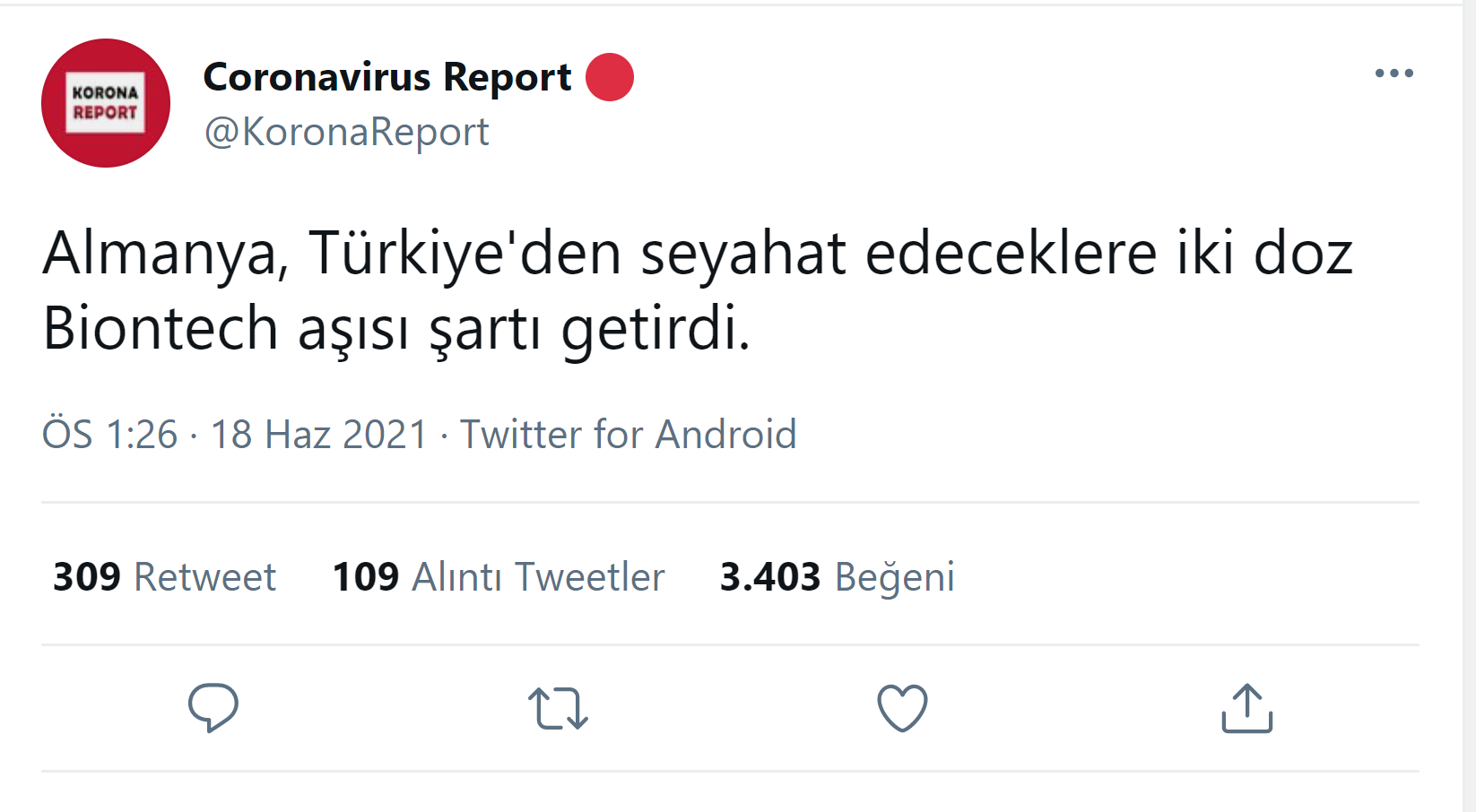 Almanya İçişleri Bakanlığı’nın kararına göre, Avrupa İlaç Ajansı’nın onay verdiği aşılardan herhangi birini olup, ikinci dozunu yaptıranlar da Türkiye’den turist olarak Almanya’ya gidebilecek. Karara göre, aşı olmayıp PCR testiyle negatif olduğunu kanıtlayanlar da karantina süresi olmadan turist olarak Almanya’ya gidebiliyor. Ancak, bazı sosyal medya sayfalarının paylaşımları konunun yanlış anlaşılmasına sebep oldu. Özellikle, “Almanya, Türkiye’den seyahat edeceklere iki doz Biontech aşısı şartı getirdi” başlığı, sosyal medya kullanıcılarında “Aşı olmayan Almanya’ya gidemeyecek” şeklinde anlaşıldı. Ve tepkiler bu yönde gösterildi.