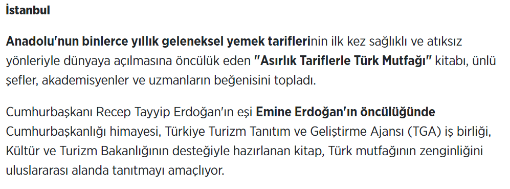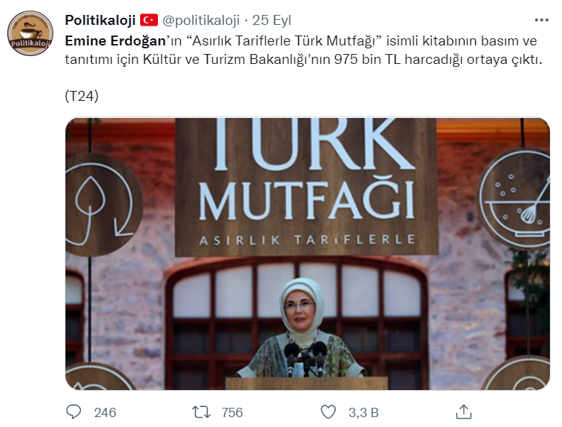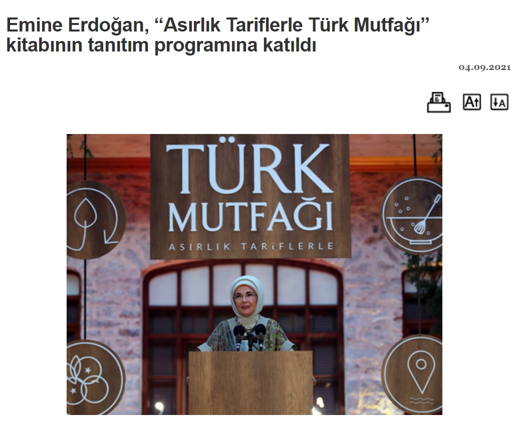 Emine Erdoğan Türk mutfağının tanıtımına ait kitap projesinin hayata geçmesine öncülük etti. Erdoğan kitabın yazarı değil. Kitabın künyesinde hazırlayanların adı yer alıyor. Proje tanıtım toplantısında çekilen fotoğraf kitabın kapağı zannedildi. EKAP’ta yer alan bilgiye göre, kitabın basımı ve tanıtımı için 975 bin TL ödendi. Kitabın hazırlığı için Editöryel kadroya ödenen miktar ise bilinmiyor.