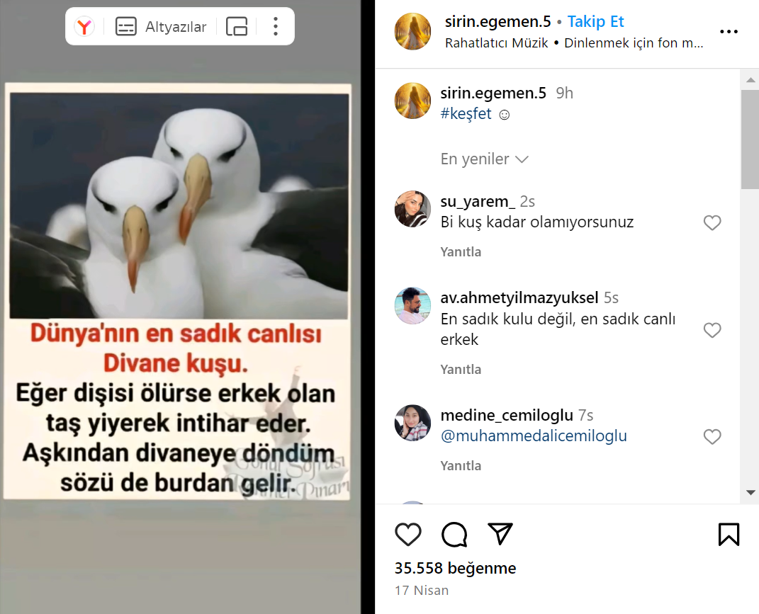 Sosyal medyada uzun zamandır paylaşıldığı anlaşılan bir bilgiye göre “aşkından divaneye dönmek” sözü, dişisi öldükten sonra intihar eden divane kuşunun hikayesine dayanıyormuş. Bu iddianın doğruluğunu inceledik.