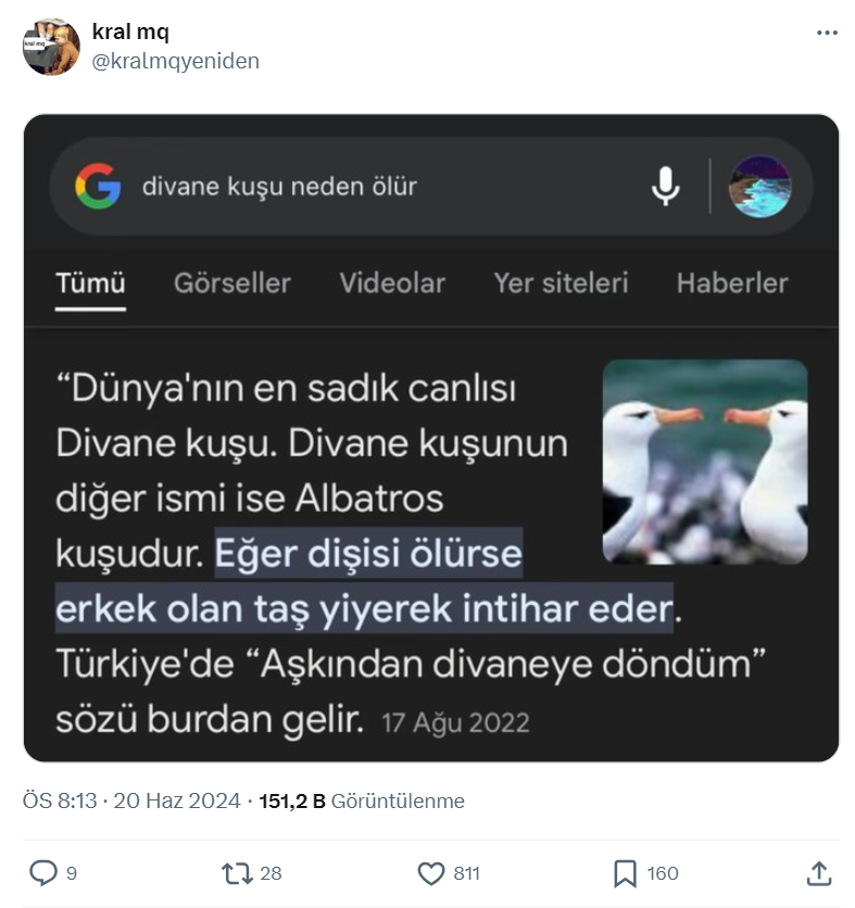 Divane kuşu ile ilgili paylaşımın ne zamandır dolaşımda olduğunu öğrenmek için internet geçmişini inceledik. 2018 yılından önce herhangi bir paylaşıma ulaşamadık. Ayrıca işaret edilen albatros kuşunun bir diğer isminin divane kuşu olduğu da herhangi bir resmi kaynakta yer almıyor.