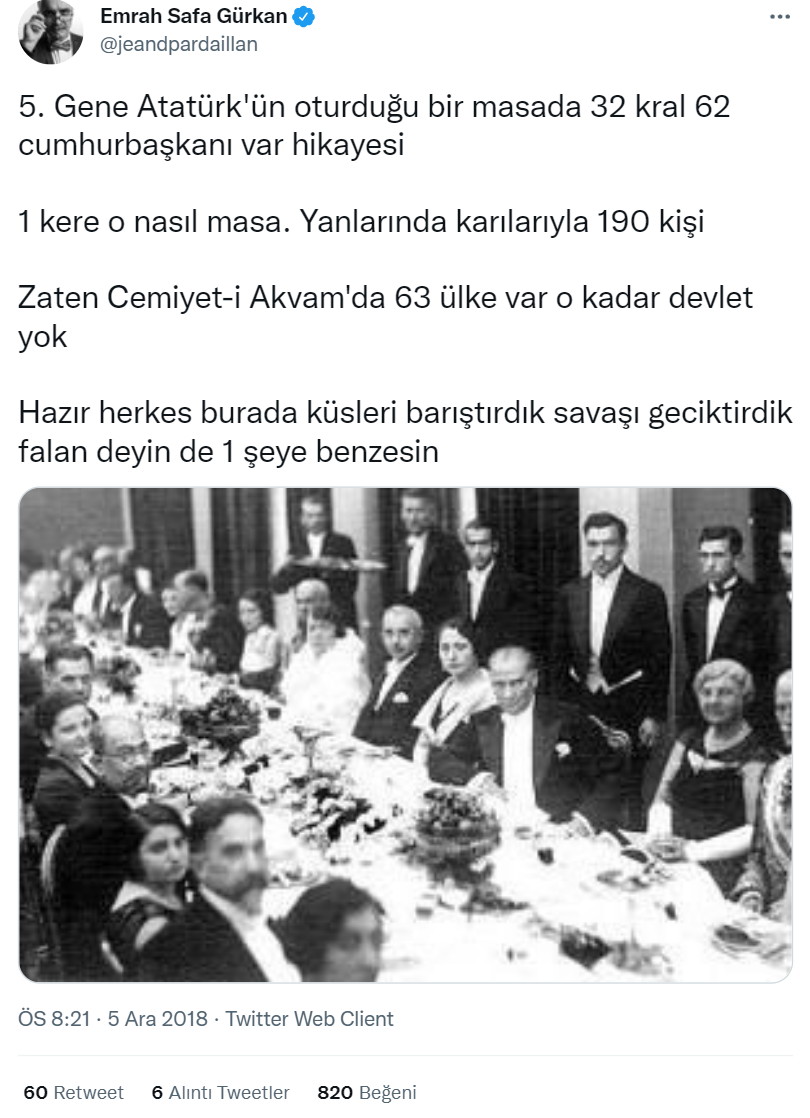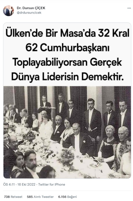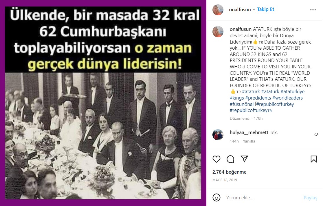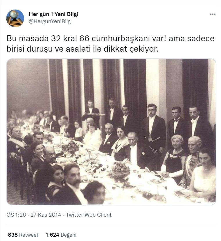 Sosyal medyada Atatürk’ün bir fotoğrafı, “Ülkende bir masada 32 kral 62 cumhurbaşkanı toplayabiliyorsan gerçek dünya liderisin demektir.” açıklaması ile paylaşılıyor.