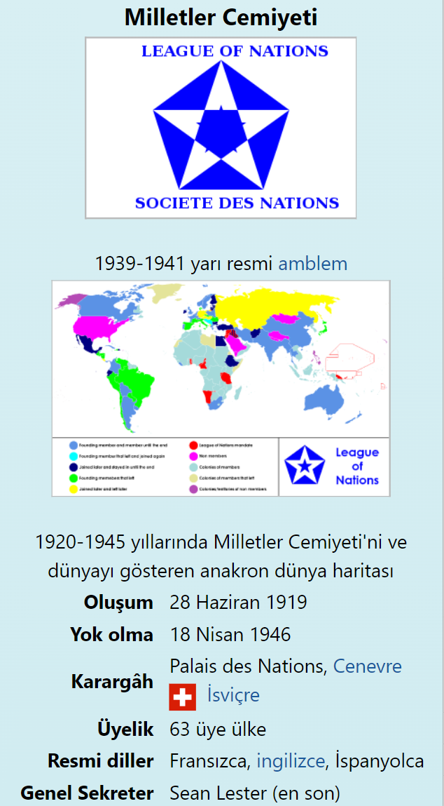 - 1919-1946 arasında faaliyet gösteren Milletler Cemiyeti’nin tanıdığı ülke sayısı 63’ten fazla değil.