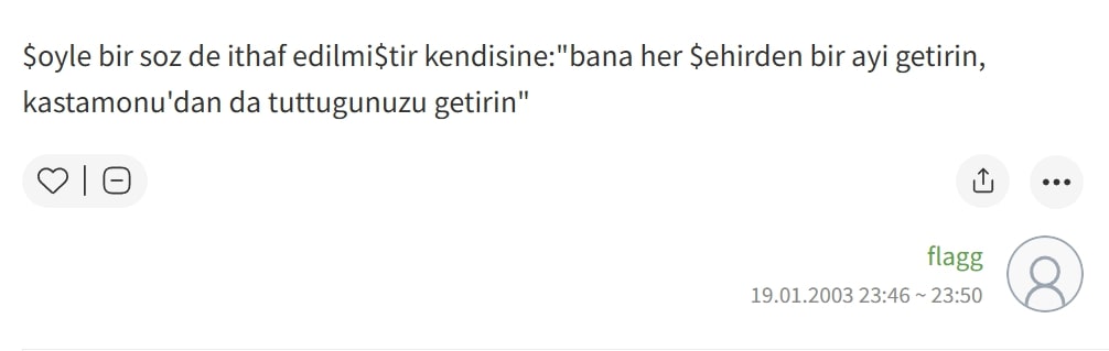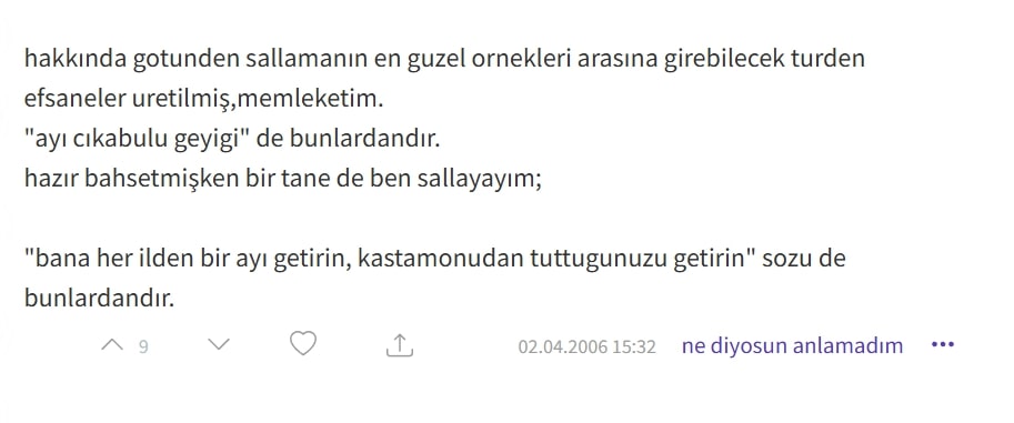 Anahtar kelime taraması bizi 2003 yılında sözlük paylaşımlarına götürüyor. Ancak burada da alıntı “her ilden bir ayı getirin Kastamonu’dan tuttuğunuzu getirin” şeklinde geçiyor.