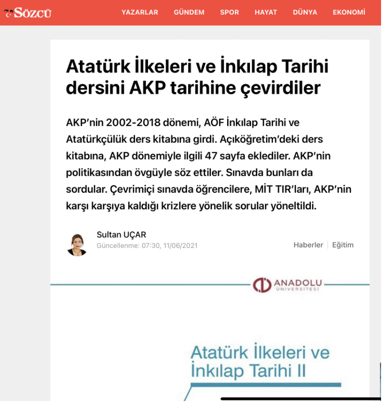 Türkiye medyasında 11.06.2021 tarihinde Anadolu Üniversitesi Açık Öğretim Fakültesi İnkılap Tarihi ve Atatürkçülük ders kitabında partizanlık yapıldığı iddası gündeme geldi. İddia Sözcü, Veryansıntv, Onedio ve T24 gibi haber sitelerinde yayınlandı. İddaya göre Anadolu Üniversitesi AÖF ders kitabında AK Parti’nin iktidarda olduğu 2002-2018 yılları 47 sayfada anlatıldı. Peki iddialar ne kadar gerçeği yansıtıyor? Açık Öğretim Sınavı ders kitabında partizanlık yapıldığı iddiası doğru mu? Yakın tarihin müfredata girmesi ne kadar yaygın?