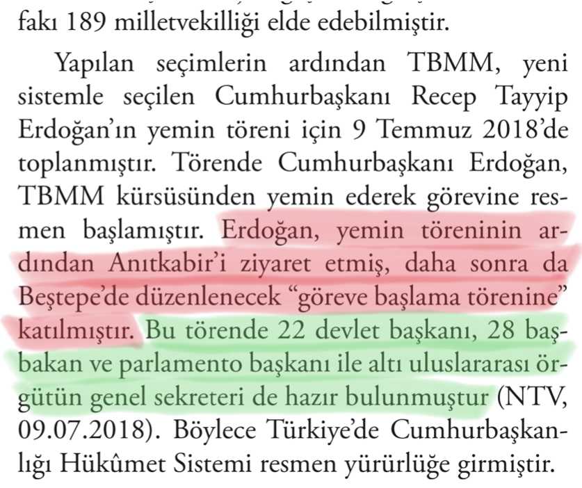 Kitabın 249. sayfasında Recep Tayyip Erdoğan’ın Cumhurbaşkanı seçilmesinin ardından Beştepe’de düzenlenen törende kaç devlet başkanı, Başbakan, parlamento başkanı ve uluslararası örgüt genel sekreterleri olduğu bilgisi verilmiştir. Aynı kitaba bakıldığında önceki 11 Cumhurbaşkanının törenlerinde katılımcı listesi hakkında herhangi bir bilgi bulunmamaktadır.