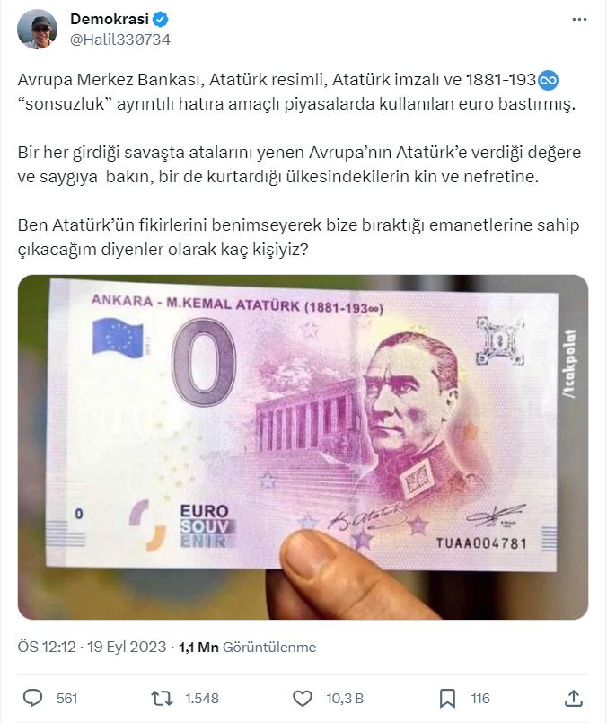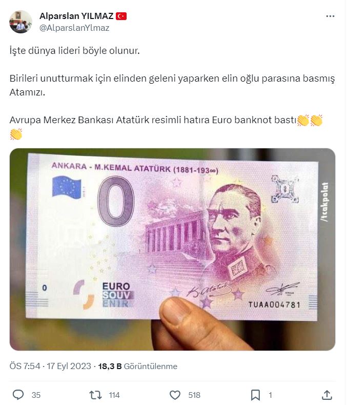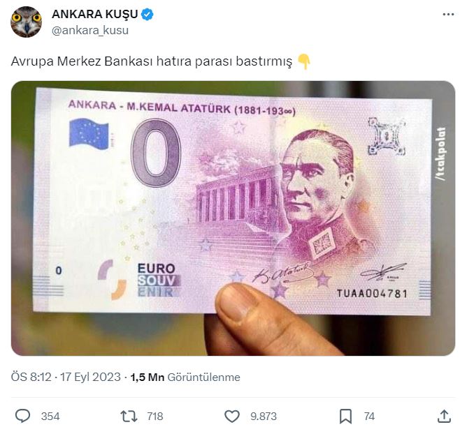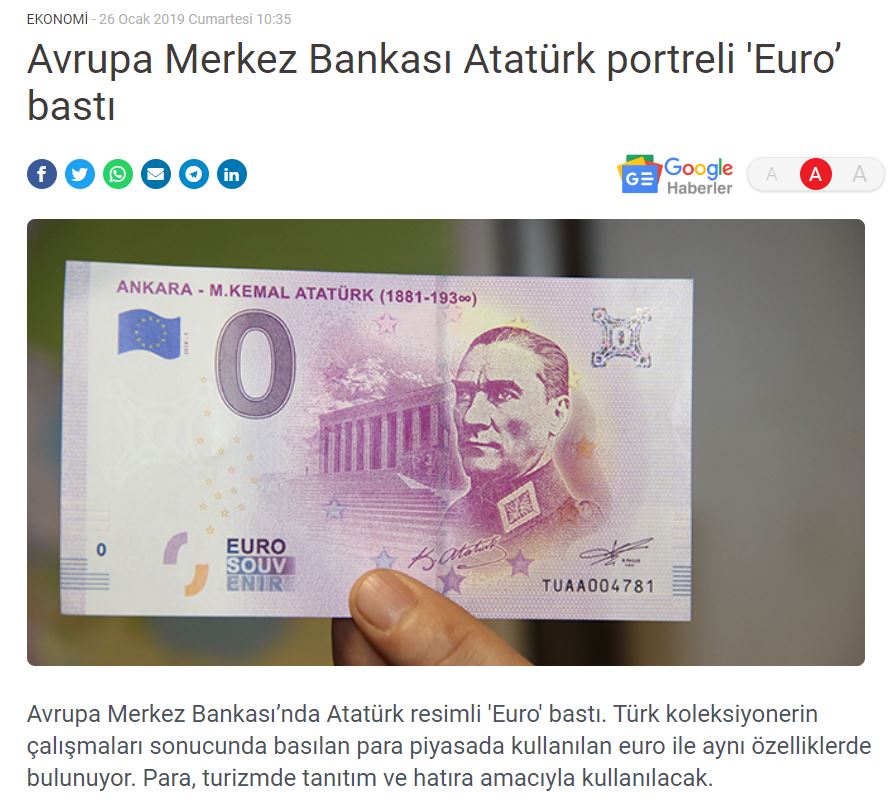 - Atatürk’ün fotoğrafının bulunduğu hatıra Euro banknotları bir koleksiyonerin öncülüğünde Euro Souvenir Banknote şirketi tarafından satışa çıkartılmış.