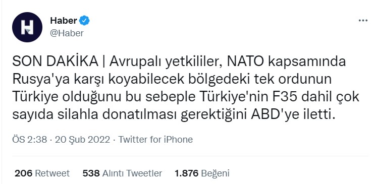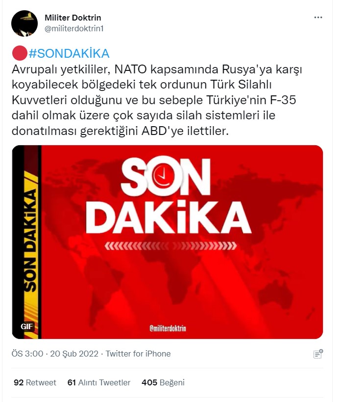 20 Şubat 2022 tarihinde paylaşılan bir iddiaya göre Avrupalı yetkililer Rusya’ya karşı Türkiye’nin silah sistemleri ile donatılması gerektiğini ABD’ye iletiyorlar. İddiada Avrupalı yetkililerin NATO kapsamında Rusya’ya karşı koyabilecek bölgedeki tek ordunun Türk Silahlı Kuvvetleri olduğunu belirttiği söyleniyor. “Bu sebeple Türkiye’nin F-35 dahil olmak üzere çok sayıda silah sistemleri ile donatılması gerektiğini ABD’ye…” ilettikleri iddia ediliyor.