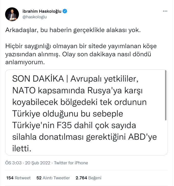 İddianın paylaşımlarından sonra gazeteci İbrahim Haskoloğlu (1. Görsel) iddianın gerçeği yansıtmadığı söylenenlerin sadece bir yazıda geçtiğini belirtti.