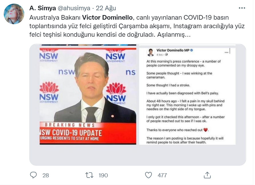 Avustralya Müşteri Hizmetleri Bakanı Viktor Dominello , Çarşamba günkü COVID-19 basın konferansında açıklamalarda bulunurken izleyiciler “göz sarkmasını” fark ederek Bakan’ın covid-19 aşısı sonrası yüz felci geçirdiği iddiasında bulundu. Aynı iddia sosyal medya platformlarında yapılan paylaşımlarla ülke sınırlarını aşarak Türkiye’de de gündeme geldi. Aşı karşıtı sosyal medya kullanıcıları bu durumu aşı olmamak için delil gösterirken, aşı taraftarı kullanıcılar olayın sebeplerinin araştırılması yönünde yorumlarda bulunuyor. ”Koronavirüs aşıları yüz felcine sebep oluyor” gibi ciddi bir iddia elbette kaygı verici. Biz de şüpheci ve sorgulayan takipçilerimizin sorularına cevap bulmak adına tüm detayları araştırdık.