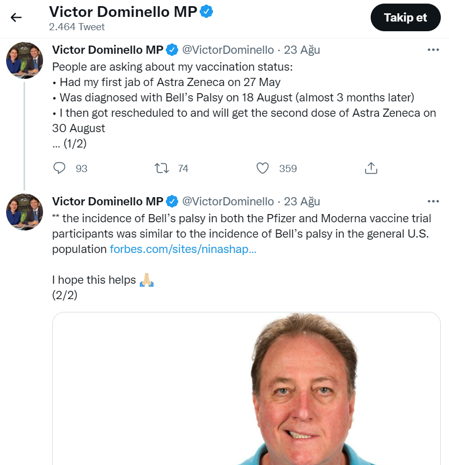 Twette: ”İnsanlar aşı durumumu soruyorlar, ilk Astra Zeneca aşımı 27 Mayıs’ta oldum. 18 Ağustos’ta Bell’s Palsy teşhisi kondu (neredeyse 3 ay sonra) daha sonra yeniden randevu aldım ve ikinci doz Astra Zeneca’yı 30 Ağustos’ta olacağım” dedi. Ardından attığı tweete bir araştırmanın linkini ekleyerek: ”Hem Pfizer hem de Moderna aşı denemesi katılımcılarında Bell’in Felci görülmesi, genel ABD popülasyonunda Bell’in Felci görülmesi ile aynı” dedi. Covid-19 aşısı olmuş kişiler üzerinde yapılan Bell’s Palsy araştırmasını örnek göstererek bir nevi hastalığının temel olarak aşıdan kaynaklanmadığını belirtti.