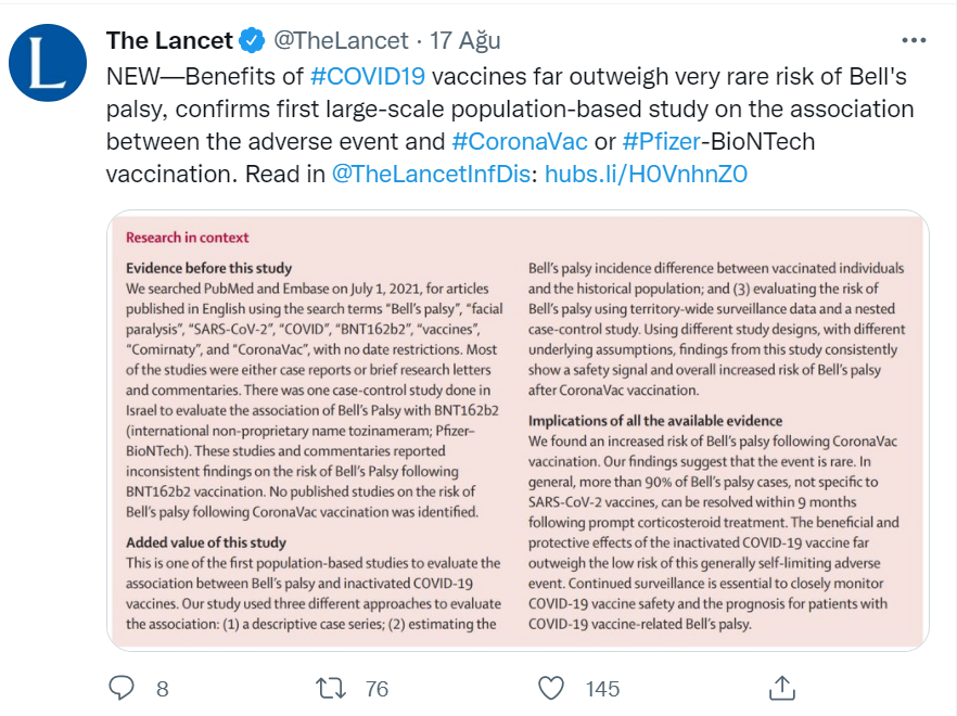 Araştırma sonucu halka, bir tıp dergisinin twitter hesabından şöyle duyuruldu: Bulgularımız, CoronaVac aşılamasından sonra Bell’in Felci riskinin genel olarak arttığını göstermektedir. Bununla birlikte, inaktive edilmiş COVID-19 aşısının faydalı ve koruyucu etkileri, genellikle kendi kendini sınırlayan bu olumsuz olayın riskinden çok daha ağır basmaktadır.