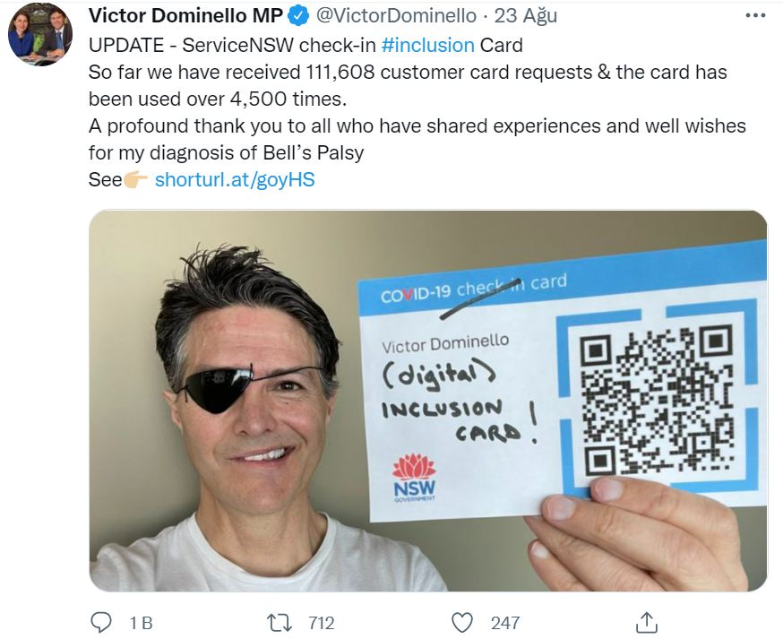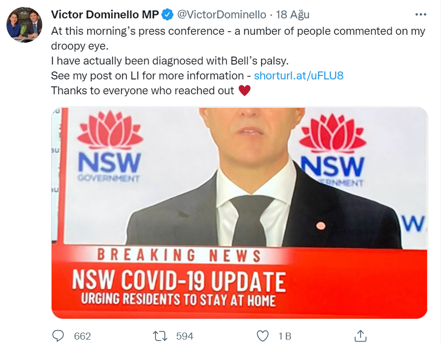 Covid-19 konferansında tek gözünün kapalı olduğu fark edilen Bakan Dominello, konferans sonrası halkın yoğun talebi ve teşviki ile tıbbi yardım aldığı bu sayede hastalığının teşhisine vesile olan herkese minnet duyduğu açıklamasında bulundu. Tweette; “bazıları felç geçirdiğimi düşündü aslında bana Bell’in Felci teşhisi kondu” dedi.