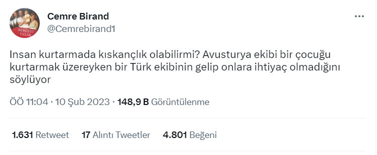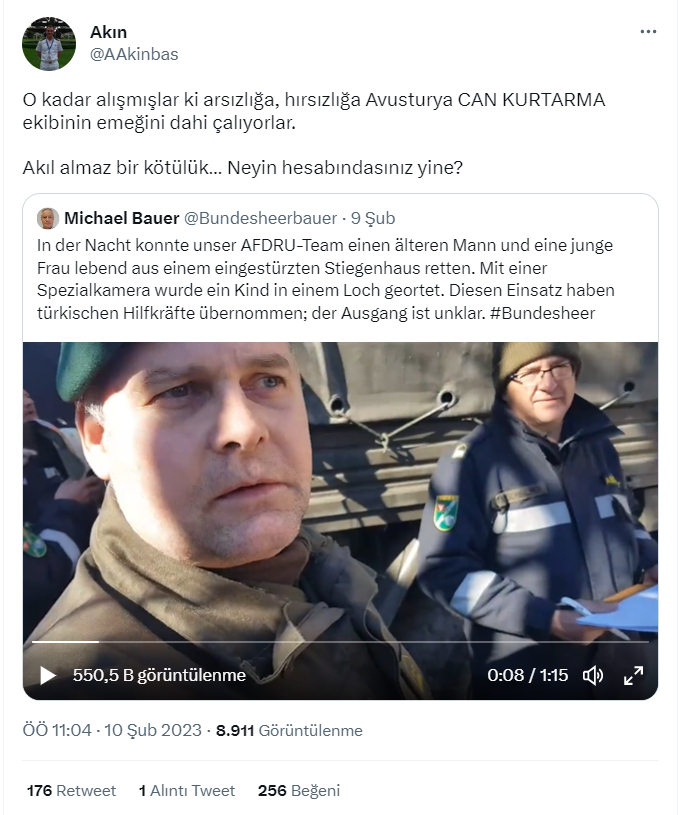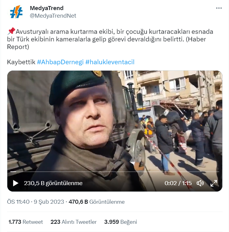 Sosyal medyada depreme ilişkin yayılıma giren son iddia ise Avusturyalı bir arama kurtarma ekibi hakkındaydı. İddiaya göre Avusturyalı arama kurtarma ekibi enkazda çalışmalarını yürütüyor ve sona yaklamışken Türk kurtarma ekibi kameralarla gelip duruma müdahale ediyormuş.