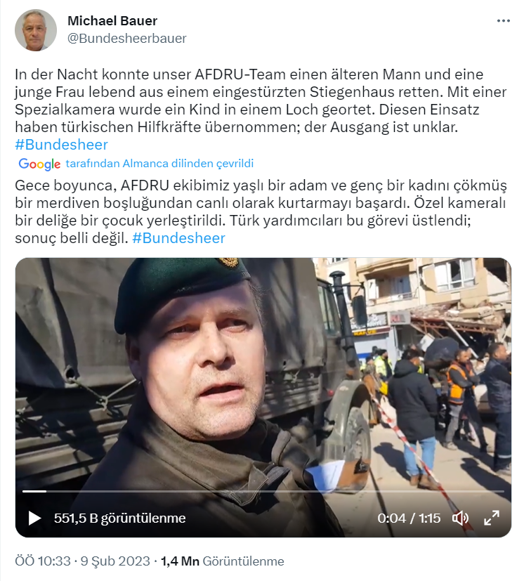 Söz konusu iddianın kaynağının Bauer’in açıklaması olduğu anlaşılıyor. Bauer’in ‘Türk yardımcıları bu görevi üstlendi’ söylemi çarpıtılmış. Arama kurtarma ekibinde bulunan ve çalışma esnasında kullanılan kameralar, televizyon kanallarının haber kamerası şeklinde algılanmış. Öyle ki Bauer, ilgili tweet’in altına bazı açıklamalarda bulunmuş.
