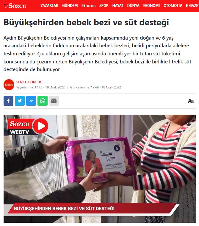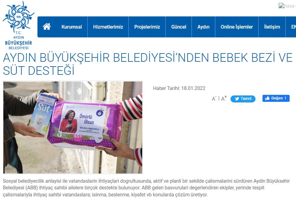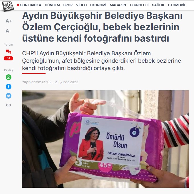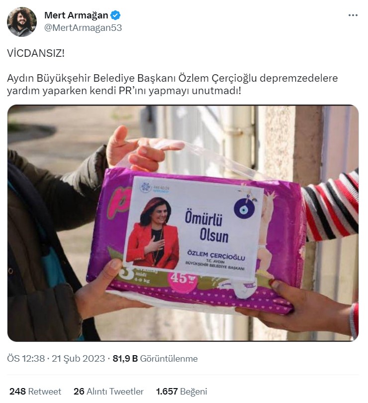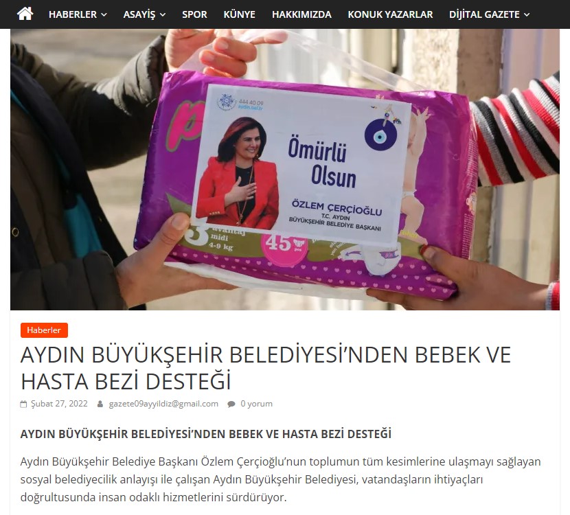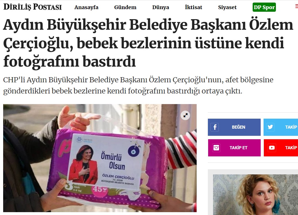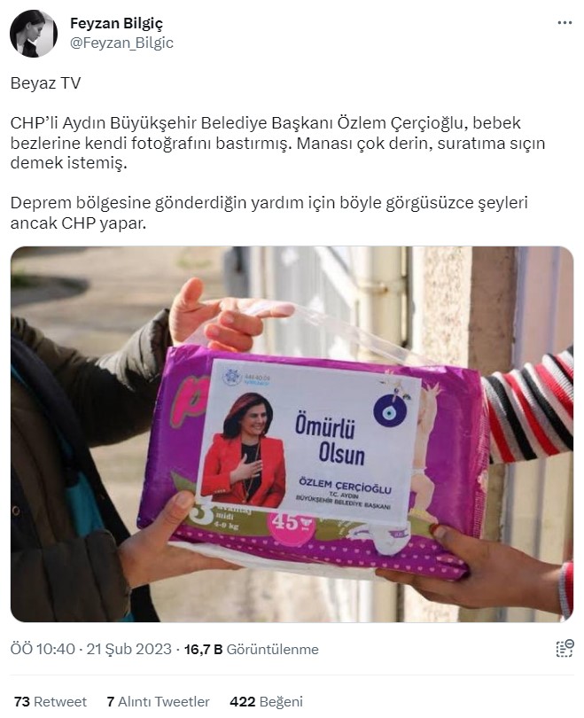Sıklıkla yayılımda olan fotoğraf için, Aydın Büyükşehir Belediye Başkanı Özlem Çerçioğlu’nun ihtiyaç sahibi depremzedelere gönderilen bebek bezinin üstüne fotoğrafını bastırdığı öne sürülmüştü. Bu iddiayı incelemek için belediyenin sosyal medya hesaplarını araştırıyoruz ancak bu fotoğrafa ya da emsali bir bulguya rastlamıyoruz.