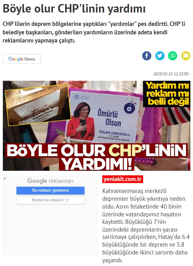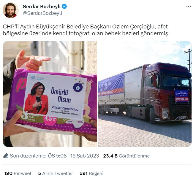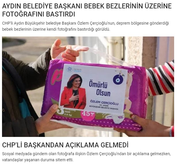 Geçtiğimiz gün sosyal medyada ve bazı haber platformlarında, Aydın Büyükşehir Belediye Başkanı Özlem Çerçioğlu‘nun sözde depremzedelere gönderilecek olan bazı ihtiyaç malzemelerinin üstüne kendi fotoğrafını koyduğu iddia edildi.