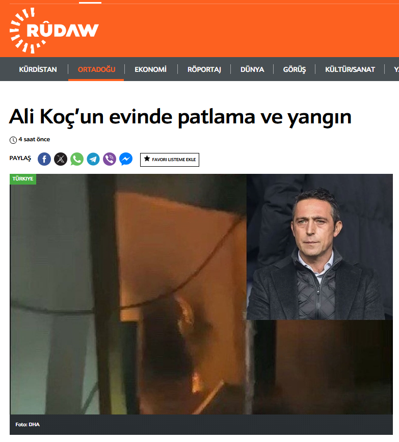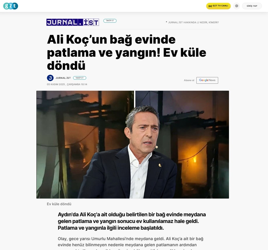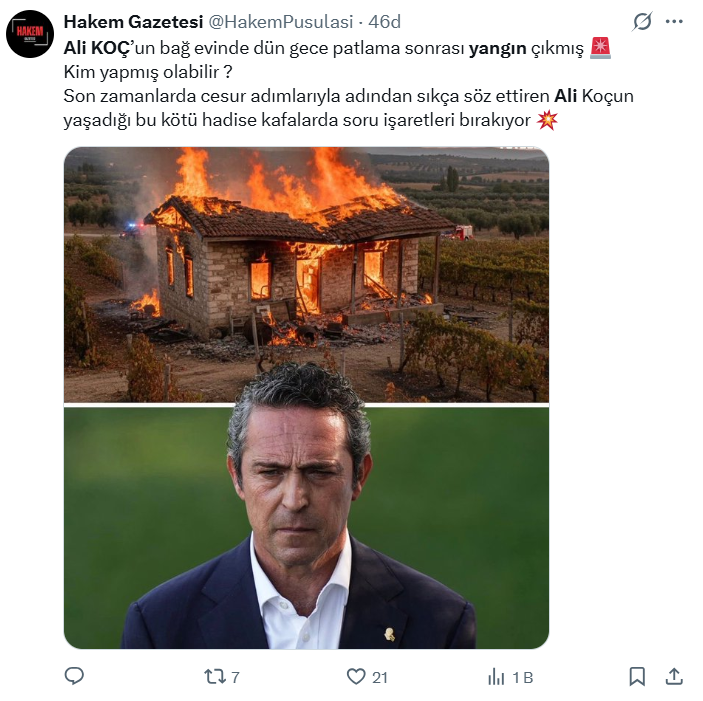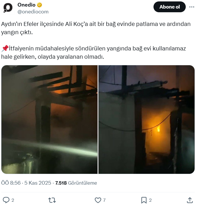 Demirören Haber Ajansı Yurthaberler birimi yetkilisiyle görüştük. Yetkili, haberin muhabiri Melek Fırat’la da görüşerek isim benzerliği olduğunu doğruladı. Yangının meydana geldiği bağ evinin iş insanı Ali Koç’la ya da Koç Holding’le hiçbir bağlantısı yok.