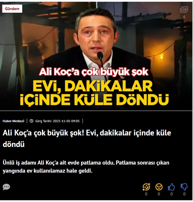 - Yanan ev, Fenerbahçe eski başkanı iş insanı Ali Koç’a ait değil. Karışıklığın sebebi isim benzerliği.