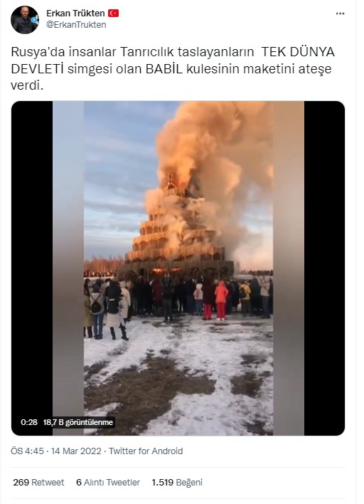 Babil Kulesi’nin replikası dünya devleti kurmaya çalışanlara bir mesaj göndermek amacıyla değil, Rusya’da Maslenitsa Bayramı’nın bir etkinliği için yakıldı. Replikayı tasarlayan kişinin açıklamalarından da replikanın ‘dünya devletini simgelemek’ gibi bir amaç taşımadığı ortaya çıkıyor.
