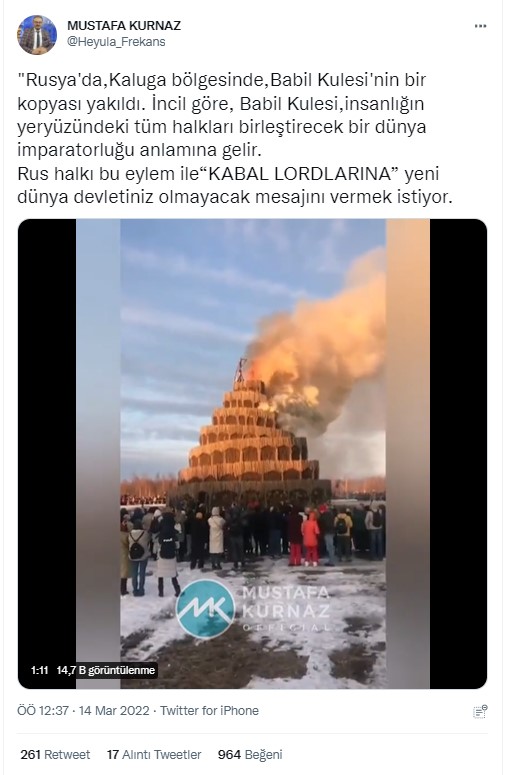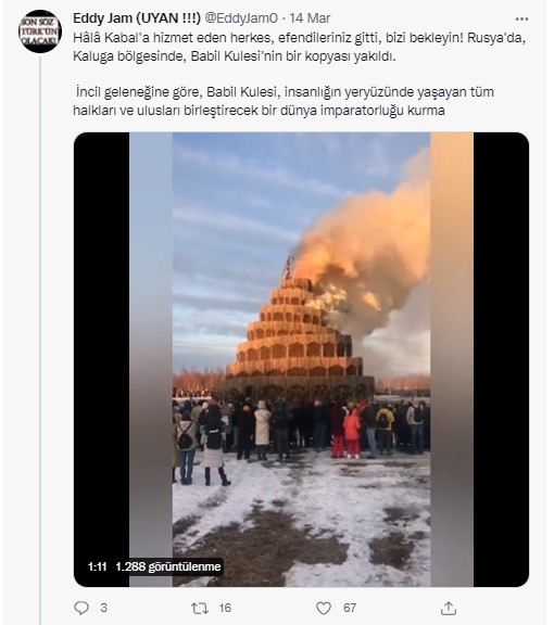 Sosyal medyada paylaşılan bir iddiaya göre Rusya’da Kaluga bölgesinde Babil Kulesi’nin bir replikası yakıldı. İddia paylaşımlarında Babil Kulesi’nin tek dünya hükümetini simgelediği ve replikanın yakılarak dünya hükümetinin kurulamayacağı mesajı verildiği söyleniyor. Bu mesajın ‘kabala lordlarına’ karşı gönderilen bir mesaj olduğu belirtilmiş.