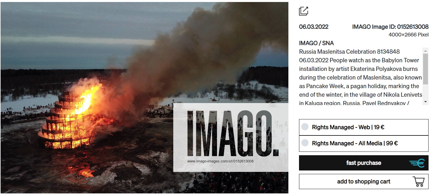 “Babylon” ve “Kaluga” kelimeleri ile arama yaptık. Paylaşımlarda olan fotoğrafa benzer bazı görseller içeren bir web sitesine ulaştık. Sitede Babil Kulesi’nin replikasının yer aldığı lisanslı stok görsellerin paylaştığı görülüyor. Fotoğrafların açıklamalarında, kulenin ‘Maslenitsa‘ isimli geleneksel bir bayramdan olduğu belirtiliyor. Replikanın ‘Ekaterina Polykova‘ isimli bir sanatçı tarafından tasarlandığını öğrendik.