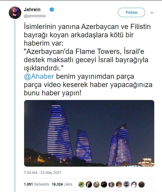 Twitter’da paylaşılan iddiaya göre Kudüs’te yaşanan şiddet olaylarının ardından İsrail’e destek amacıyla, Bakü’de yer alan ünlü Ateş Kuleleri’nde İsrail Bayrağı sergilendi. İddiaya konu olan görsel aşağıdadır. Ahmet Sonuç isimli, Jahrein mahlaslı dijital içerik üreticisinin konuyla alakalı tweet’inin ardından, iddia hızla yayılmış bir çok yüksek takipçili hesap tarafından iddia paylaşılmıştır.