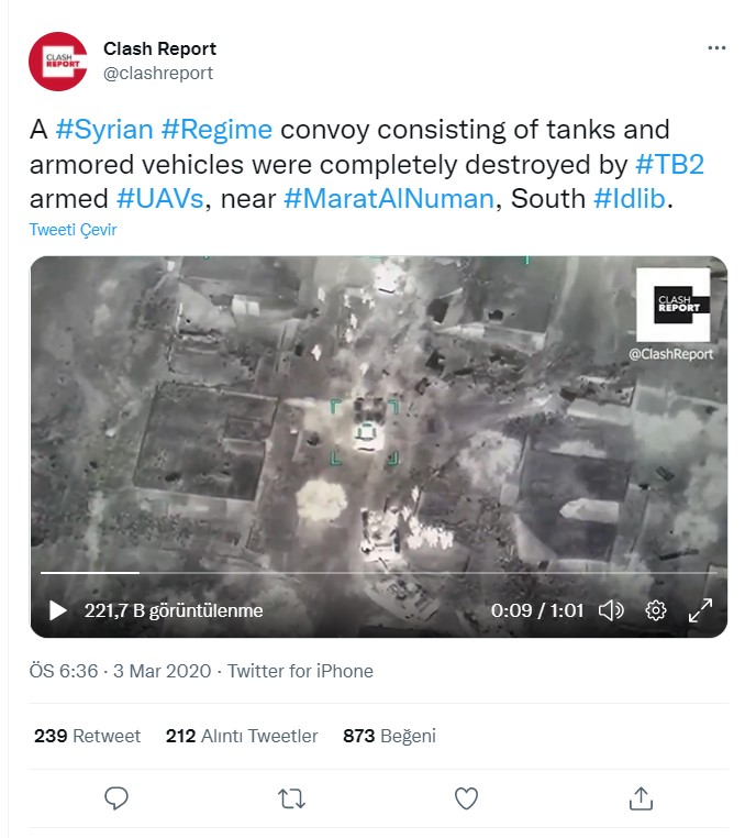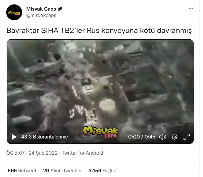 Dolaşımdaki video, Ukrayna-Rusya çatışmasına ait değil. Videoda 2020 yılında Suriye’de TB2’nin Esad rejimi konvoyunu vurduğu belirtilmiş. Clash Report isimli bir Twitter hesabı videoyu bu başlık ile 3 Mart 2020’de paylaşmış. Dolayısıyla video iddia edildiği gibi gündemde olan Rusya-Ukrayna çatışmalarını göstermiyor.