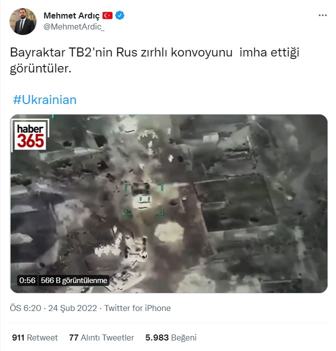 Rusya’nın Ukrayna saldırısı sonrası sosyal medyada pek çok video ve görüntü paylaşılıyor. İddia edilen paylaşımların biri de Rusya ile Ukrayna arasında yaşanan operasyonları gösterdiği bir video görülüyor. Askeri termal kamerayla kaydedildiği anlaşılan bir görüntüde zırhlı araç konvoyuna hava saldırısı yapıldığı anlaşılıyor. Bu videoların başlığında ise Ukrayna’da Bayraktar TB2’nin Rus konvoyunu vurduğu söyleniyor.