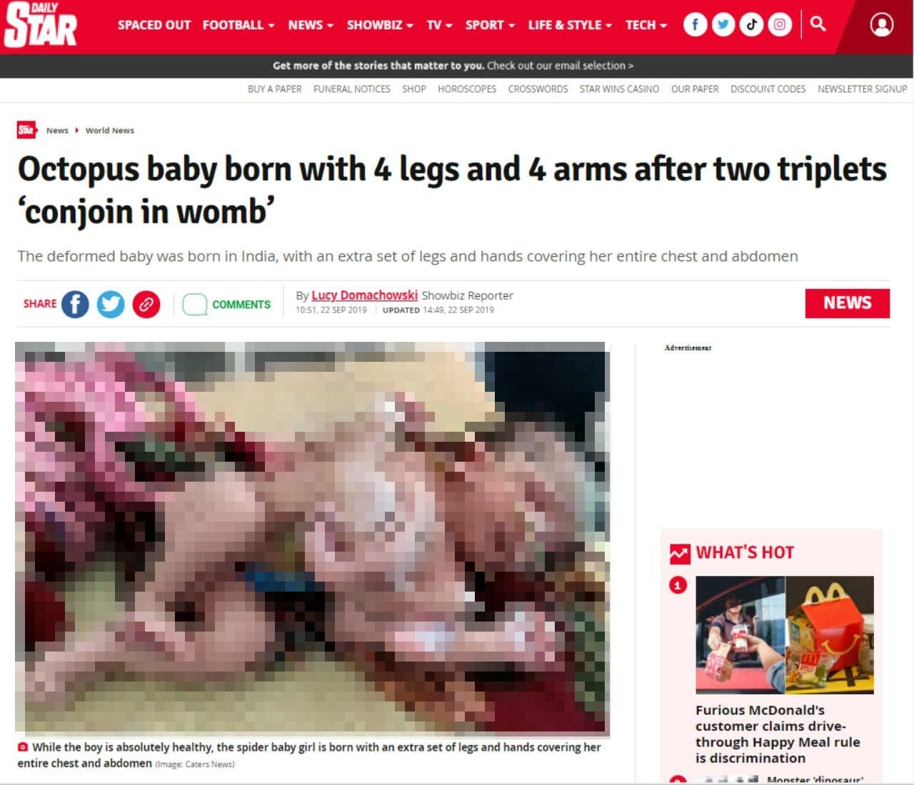 Bu görselin pek çok haber mecrasında Eylül 2019’da paylaşıldığını gördük. Mirror UK, Daily Star, New York Post ve Sputnik gibi belli başlı bazı haber sitelerinde yer alan bilgilere göre; göğüs ve karın bölgesinde ekstra kol ve bacaklarla doğan bu bebek Hindistan’da dünyaya gelmiş.