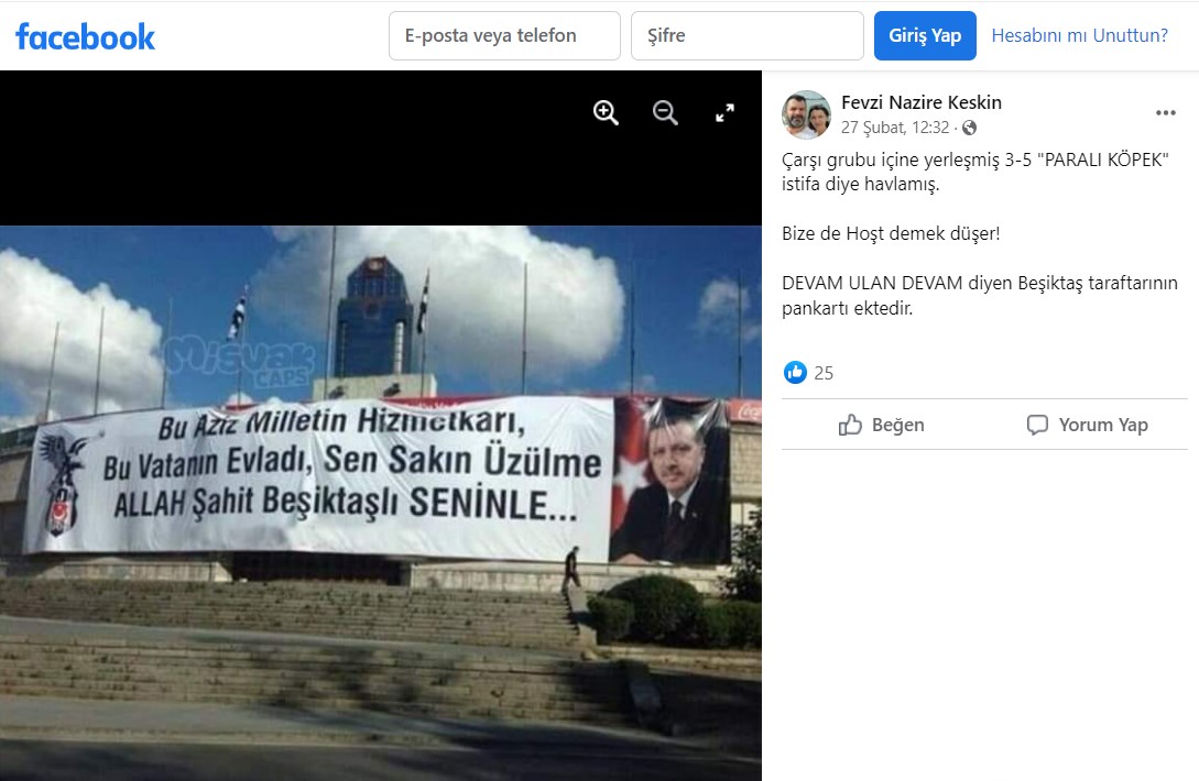 “Beşiktaşlı seninle” yazılı pankartın Beşiktaş taraftar grubu tarafından asıldığı ve güncel olduğu iddiası