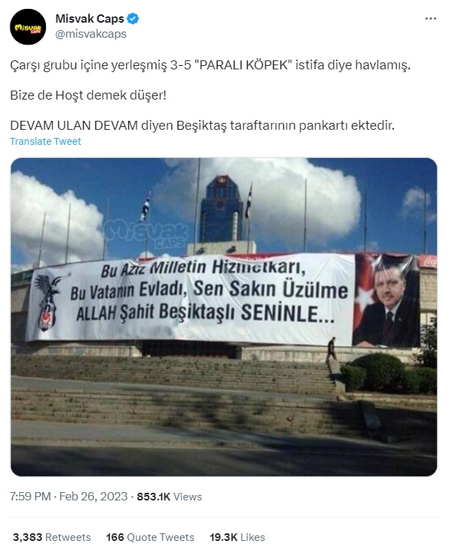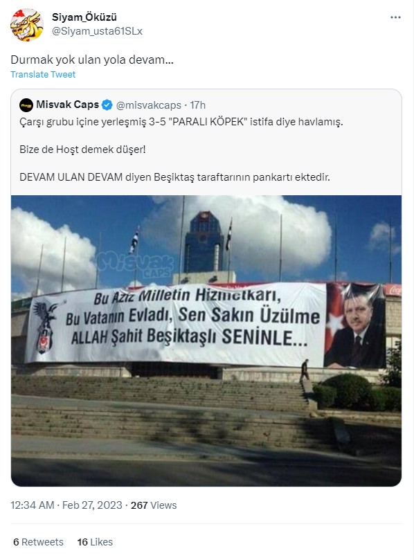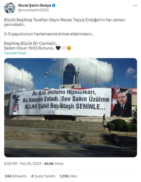 Dolayısıyla futbol karşılaşmalarında depremzedelere verilen destek mesajları ve AK Parti hükümetine yapılan olumsuz eleştiriler de sosyal medyada en çok konuşulan konular arasında yer aldı. Bir sosyal medya paylaşımında, İnönü Stadı’na asılan Recep Tayyip Erdoğan’a destek pankartının Beşiktaş taraftarı tarafından asıldığı iddia edildi.