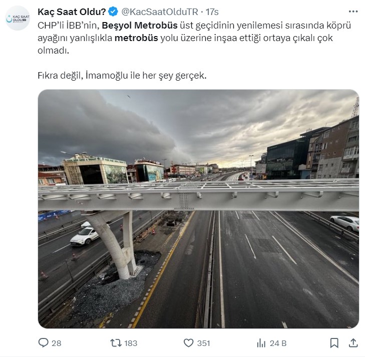 Seçim dönemi yaklaşırken yerel seçimler öncesinde birçok haber kanalı ve platformunda doğruluk kontrolüne muhtaç bilgi ile karşılaşıyoruz. Bunlardan biri de geçtiğimiz günlerde internette yayılım gösteren, “İBB’nin Beşyol’daki üst geçit yenileme çalışmasında, köprüyü yeniden konumlandırırken yanlışlıkla metrobüs yoluna inşa ettiği” yönündeydi.