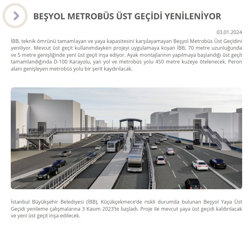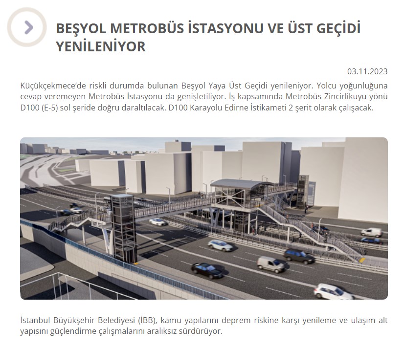 Anahtar kelimelerle konuyu araştırdığımızda, ilgili çalışmaya dair bilgilendirici yazıya ulaşıyoruz. İBB’nin Ulaşım Yönetim Merkezi (UYM) web sitesinde Beşyol metrobüs durağındaki çalışma ile metrobüs yolunun genişletileceği ve bununla birlikte daha rahat yolcu aktarımını sağlamak amacıyla üst geçidin yıkılıp yerine daha geniş bir üst geçit inşa edileceği bildirilmiş. İlgili yazıda bahsedilen kısım şöyle: