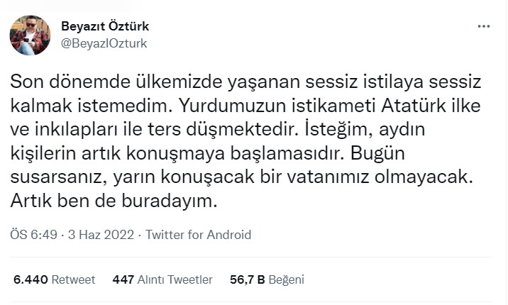 Beyazıt Öztürk’ün ‘sessiz istila’ temalı tweet attığı iddiası